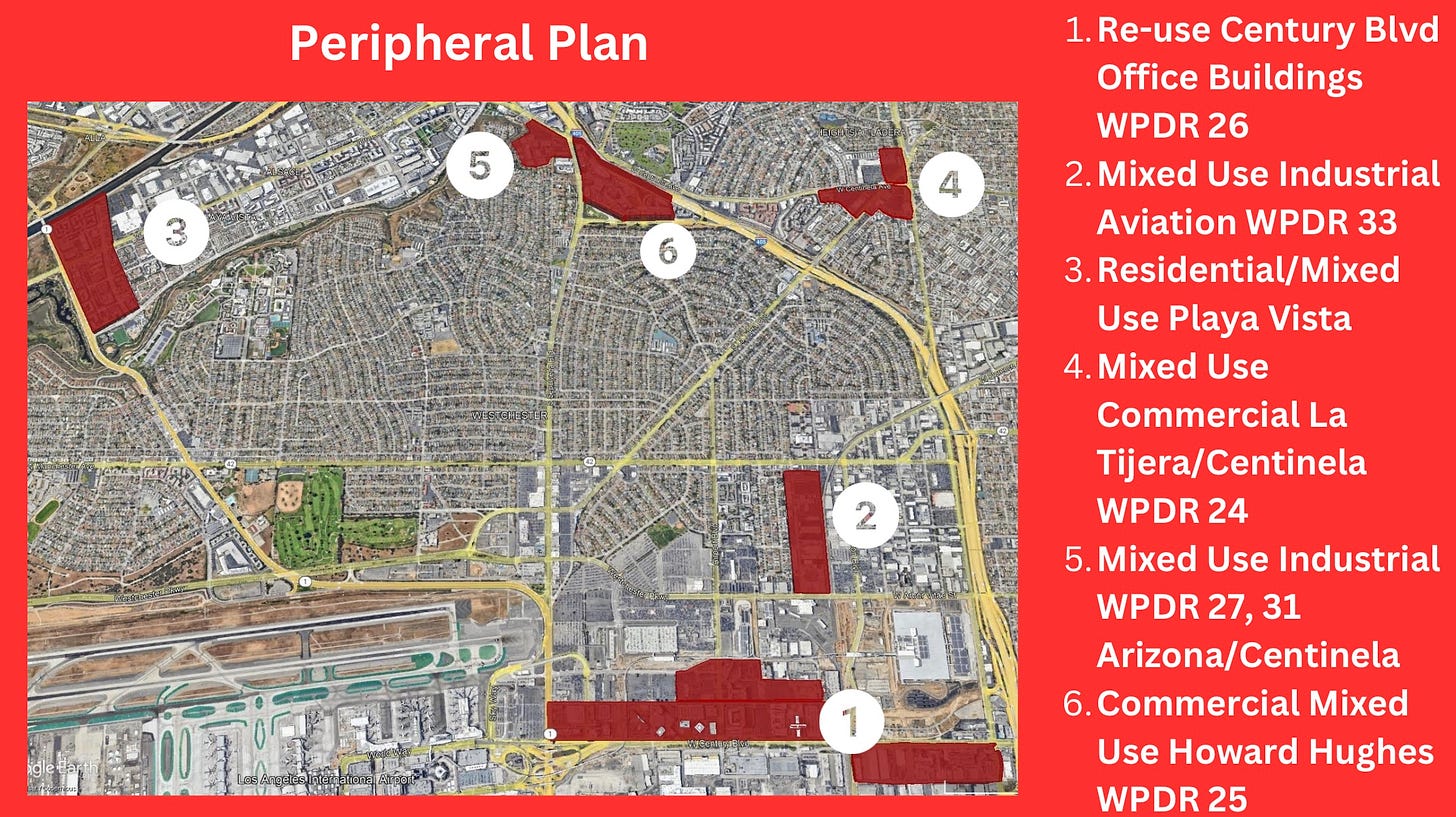 We met on several occasions with Jeff Khau, CD 11 Planning and Transportation Deputy and Sean Silva, Westchester/Playa Field Deputy, to discuss CD 11’s position and to emphasize the benefits of our Peripheral Plan.