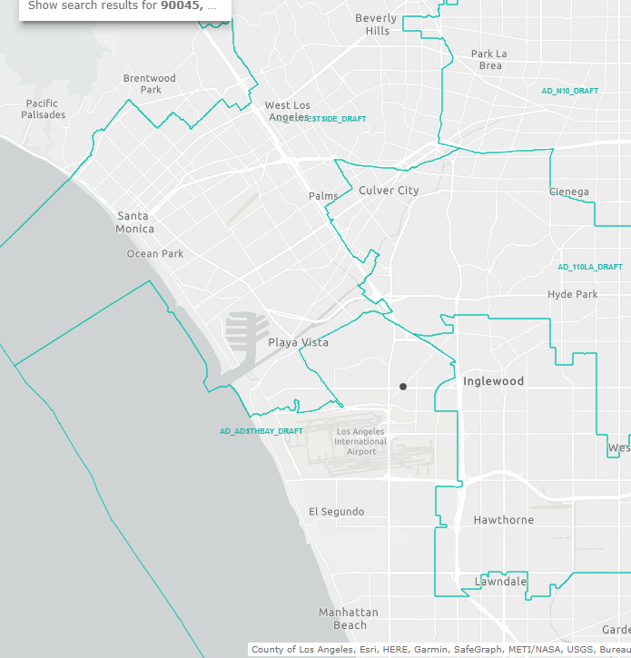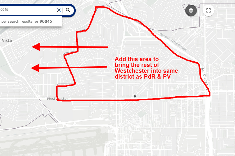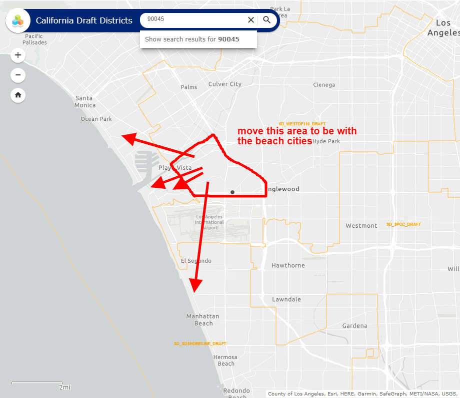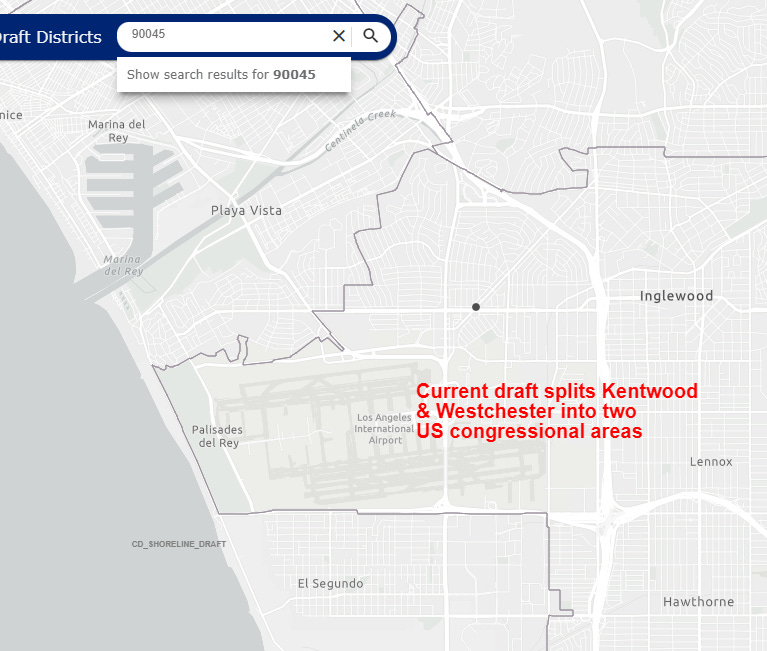 Here is what you do to submit comments. Use this link. Identify yourself as a Westchester community member and tell them you are providing feedback on the Congressional Districts Draft Map. If you agree with my position, tell them you want all of zip code 90045 (including LAX) moved into the same district as Playa del Rey & Playa Vista because we share a community of interest inasmuch as we are in the same city Neighborhood Council area and regularly address local issues together as a block.