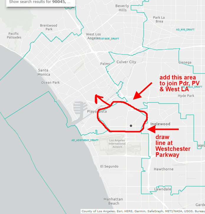 Here is what you do to submit comments. Use this link. Identify yourself as a Westchester community member and tell them you are providing feedback on the Assembly Districts Draft Map. If you agree with my position, tell them you want all of zip code 90045 north of Westchester Parkway and all of zip code 90293 (Playa del Rey) moved into the same district as Playa Vista (zip code 90094) because we share a community of interest inasmuch as we are in the same city Neighborhood Council area and regularly address local issues together as a block.