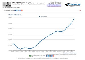 But let’s talk about LA. It’s huge and is a story of micro-economies. Our beach cities felt quite frothy over the last few years, but if you look at the graph below, our upward trajectory has been consistent for the last 10 years.