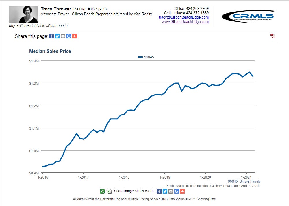 All graphs presented herein show data for the last five years on a rolling 12-month average to smooth the bumps. The data shown is also for single-family homes. If you want condo or combined data for Westchester 90045, or custom graphs for other areas, just ask!