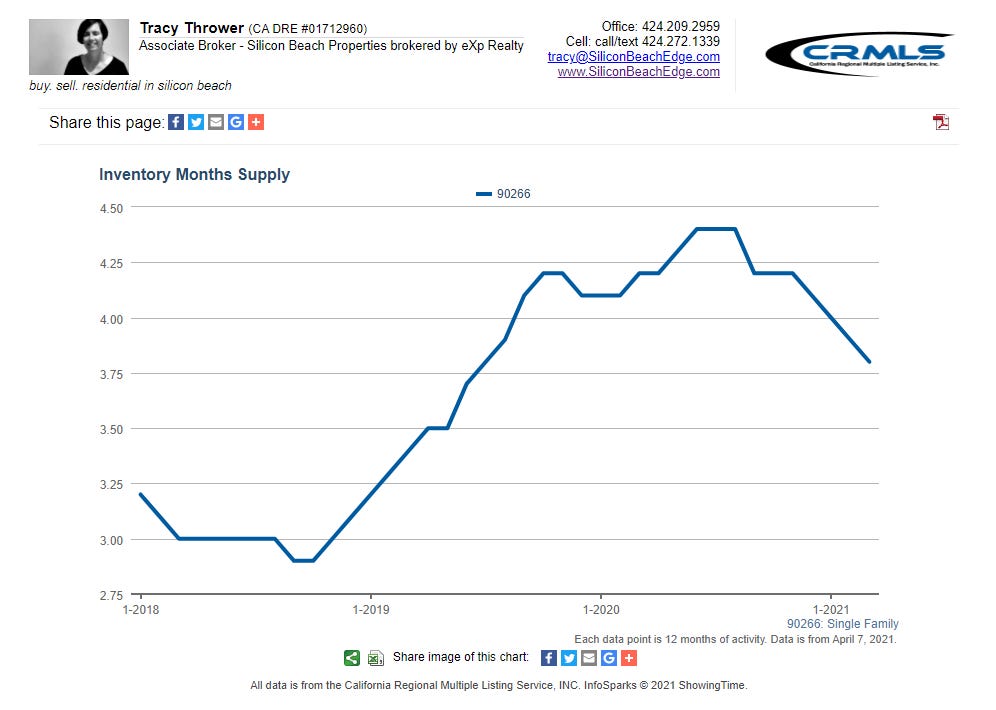 Six months of inventory is considered a "neutral" market where neither sellers nor buyers hold an advantage. Some even consider four months to be the neutral space where the advantages shift. With Manhattan Beach's inventory dropping for a fourth consecutive month to 3.8 months, the trend in favor of sellers holding the upper hand continues.