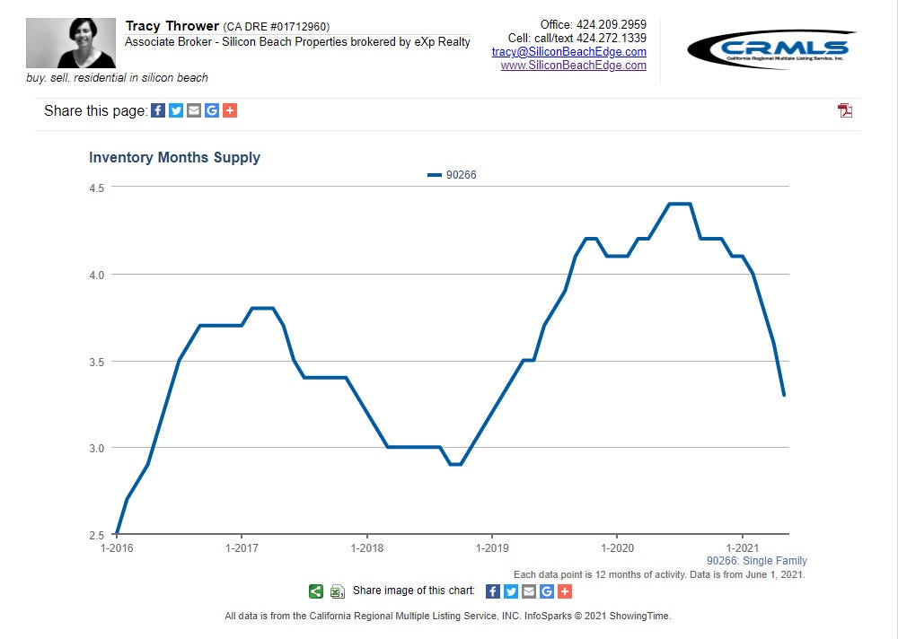 Six months of inventory is considered a "neutral" market where neither sellers nor buyers hold an advantage. Some even consider four months to be the neutral space where the advantages shift. With Manhattan Beach's inventory dropping for a sixth consecutive month to 3.3 months, the trend in favor of sellers continues in Manhattan Beach.