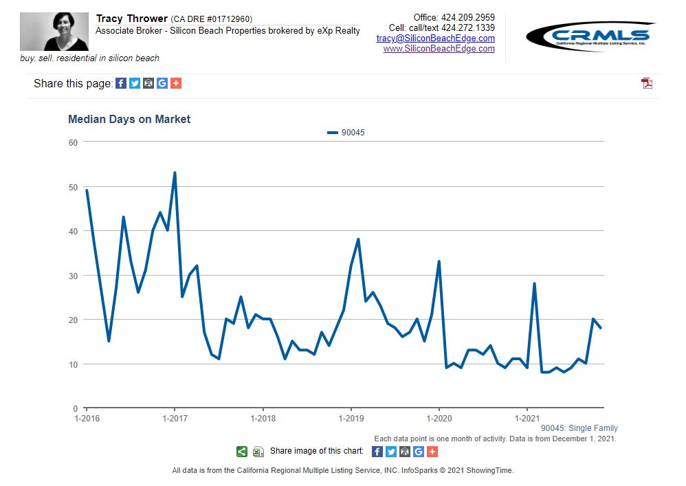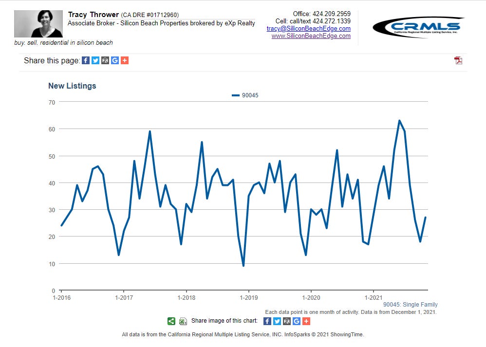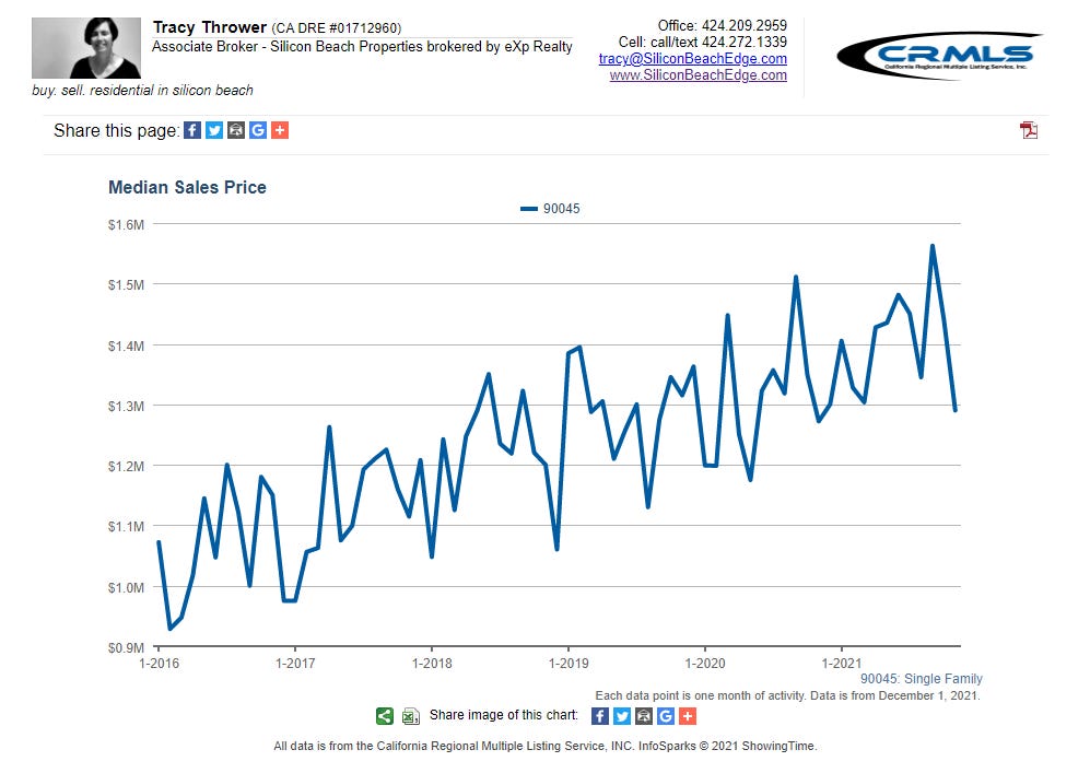 All graphs presented herein show data for the last five years on a rolling 12-month average to smooth the bumps. The data shown is also for single-family homes. If you want condo or combined data for Westchester 90045, or custom graphs for other areas, just ask!