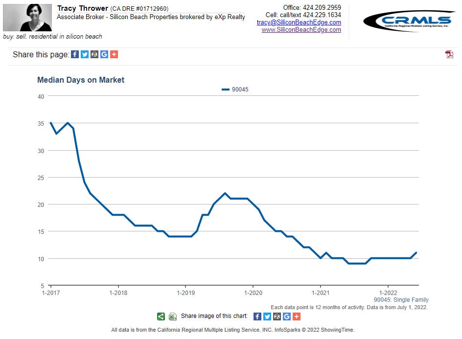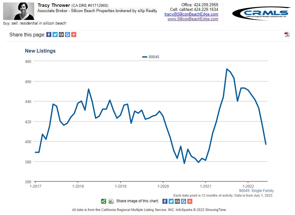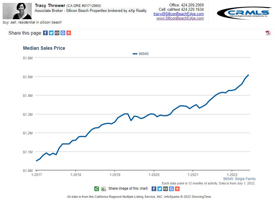 All graphs presented herein show data for the last five years on a rolling 12-month average to smooth the bumps. The data shown is also for single-family homes. If you want condo or combined data for Westchester 90045, or custom graphs for other areas, just ask!