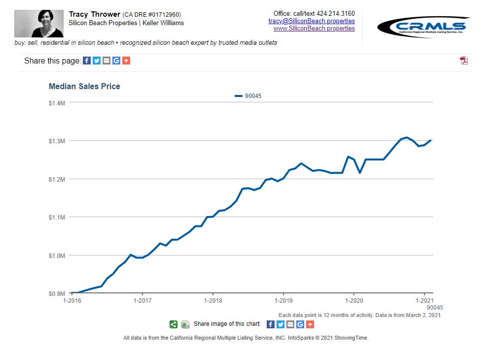 All graphs presented herein show data for the last five years on a rolling 12-month average to smooth the bumps. The data shown is also for single-family homes. If you want condo or combined data for Westchester 90045, or custom graphs for other areas, just ask!