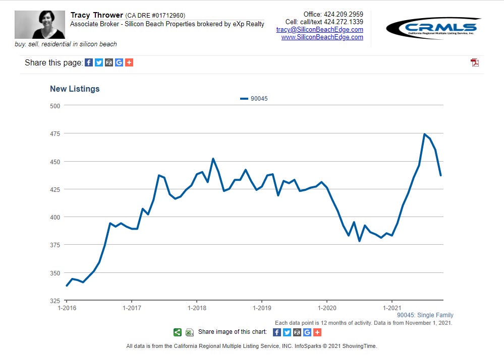 The MLS dropped its October listings data last week and I’m seeing a continuation of the super-tight inventory situation in Westchester 90045. Trendline says → super sellers’ market continues.
