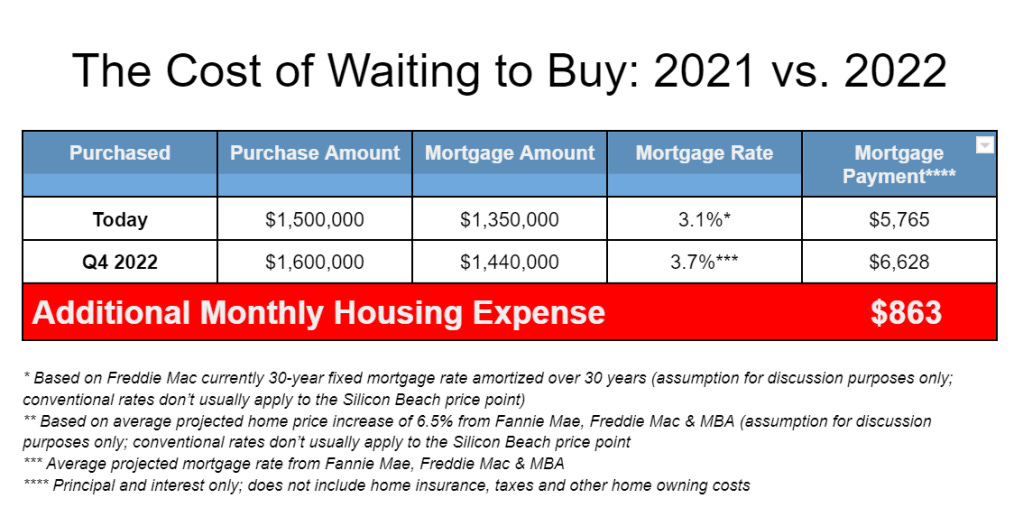 Also consider that if you buy now rather than the end of next year, you will pick up an estimated $97,500 in forecasted equity next year, in addition to the $10,356 in mortgage savings for the year. Do you see why I keep banging the drum for buyers to act sooner rather than later. And this is just buying the median priced Silicon Beach home at $1,500,000. Many of my readers are shopping at higher price points.